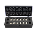 The box itself is injection molded of a high impact polystyrene for rigidity. The lid and base feature a positive locking mechanism for a secure closure. It is also pre-packed with a special die-cut V16 foam and includes one tooth graphic per box for easy set-up.